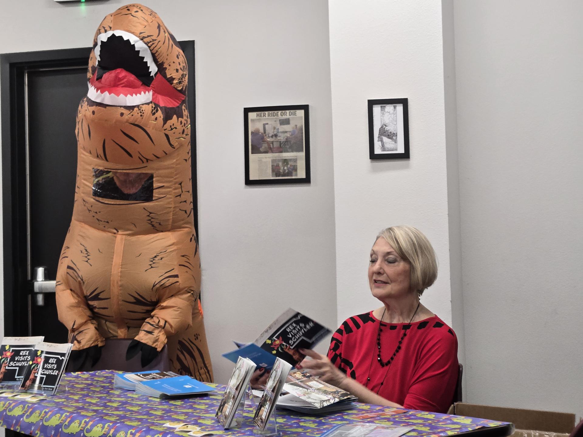 At the Schuyler Library, there are parents and children gathered around a table laid out with dinosaur and patriotic red, white, and blue cookies. There are doting grandparents, representatives of Nebraska Growing Readers (NGR), and the librarian. There is the local Scout troop. And, in the midst of it all, there is a 10-foot orange-brown T-Rex working the crowd.