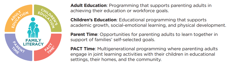 We talk about family literacy and the adoption of shared reading habits a lot, but what does family literacy actually mean? This month, we’d like to take some time to explore the federal definition of Family Literacy with our partners at the Statewide Faily Engagement Center and National Center for Families Learning. Family Literacy has 4 components: -